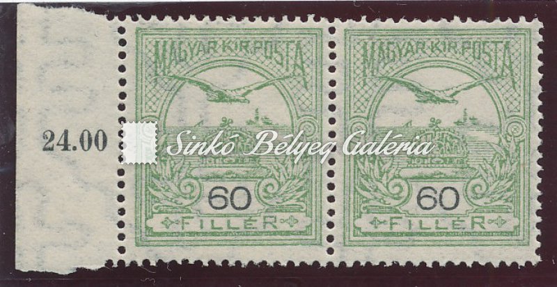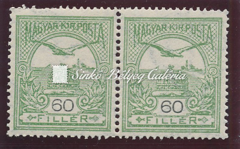 | Leírás | 1913. Turul 60f bélyegpár A álló vízjeles, vízszintesen összefüggő I. - II. típusú bélyegek. / 1913. Turul 60f stamp pair with A standing watermark, horizontally coherent stamps, type I. - II. |