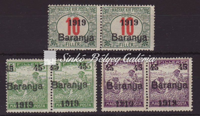 | Leírás | 1919. Baranya I. (Szerb megszállás ) Vízszintes párokban. A második bélyeken a Baranya B betűjének felső része ugyanakkora mint az alsó része. Bodor M. bélyegszakértő hátoldali bevizsgáló jelével. / 1919. Baranya I. (Serbian occupation) In horizontal pairs. On the second stamp the upper part of the letter B in Baranya is the same as the lower part. With the stamp expert, M. Bodor's test sign on the back side. |