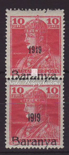 | Leírás | 1919. Baranya I (Szerb megszállás) 10f. Károly függőleges párban, látványosan elcsúszott felülnyomattal. Az 1919-es évszám a groteszk helyett antikva. Bodor M. bélyegszakértő hátoldali bevizsgáló jelével. / 1919. Baranya I (Serbian occupation) 10f Károly stamp in vertical pairs. With spectacularly shifted overprint. The year 1919 is antiqua instead of grotesque. With the stamp expert, M. Bodor's test sign on the back side. |