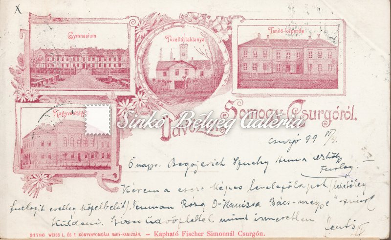 | Description | Gimnázium, Tűzoltólaktanya, Tanítóképző, Nagyvendéglő A képeslap hátoldala hosszú címzésű. / The back side of the postcard has long address. vasúti bélyegzés / railway stamping |