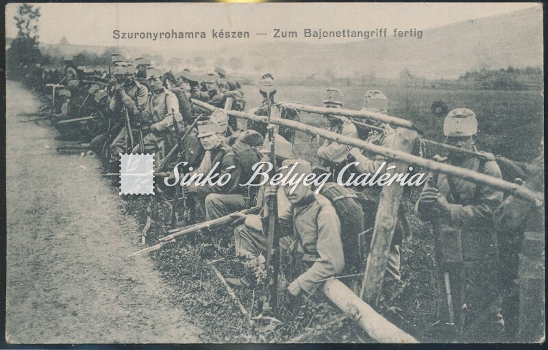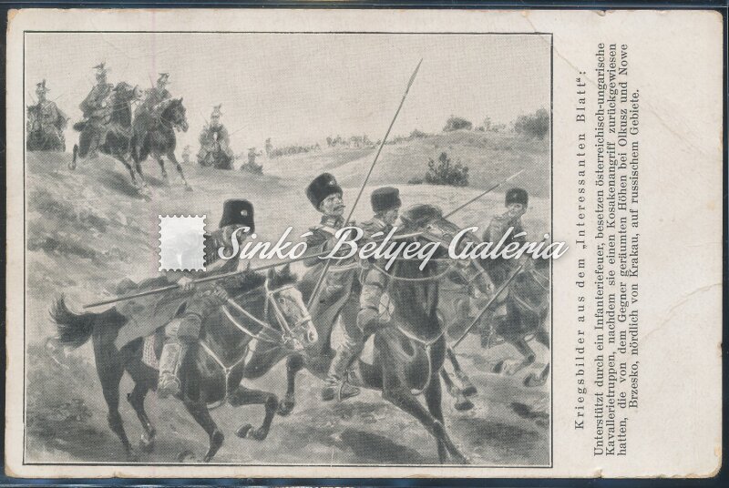 | Leírás | Háborús képek az "Interessantes Blatt" című lapból: Gyalogsági tűzzel támogatott osztrák-magyar lovascsapatok elfoglalják az Olkusz és Nowe Brzesko melletti magaslatokat Krakkótól északra, az ellenség által megálmodott orosz területen, miután visszavertek egy kozák támadást. / War pictures from the "Interessantes Blatt": Supported by infantry fire, Austro-Hungarian cavalry troops occupy the heights near Olkusz and Nowe Brzesko, north of Krakow, on Russian territory, which had been dreamed of by the enemy, after repelling a Cossack attack. A képeslap hátoldala osztott. / The backside of the postcard is divided. |