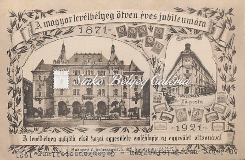 Budapest - Magyar Levélbélyeg Gyűjtők első hazai egyesüleemléklapja az egyesület otthonával és Fő posta