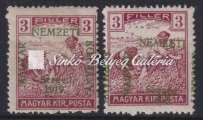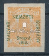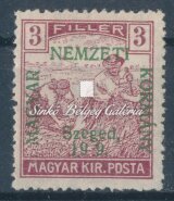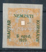 Leírás | 1919. Szeged (Francia megszállás) 2f Hírlapbélyegen, a felülnyomat NEMZETI feliratának "M" betűje hiányos! Bodor M. bélyegszakértő hátoldali bevizsgáló jelével. / 1919. Szeged (French occupation) On 2f Newspaper stamp, the letter "M" of the subtitle NEMZETI of the overprint, is deficient! With the stamp expert, M. Bodor's proof sign on the backside. |