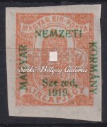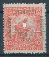 Leírás | 1919. Szeged (Francia megszállás) Hírlapbélyegen a SZEGED felirat G betűje hiányos, valamint a felülnyomat gépszínátnyomatával! Bodor M. bélyegszakértő hátoldali bevizsgáló jelével. / 1919. Szeged (French occupation) On a Newspaper stamp, the letter G of the word SZEGED is incomplete, futhermore with the machine colour print of the overprint! With the stamp expert, M. Bodor's proof sign on the backside. |