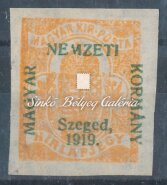 Leírás | 1919. Szeged (Francia megszállás) 2f Hírlapbélyegen, a felülnyomat 1919-es évszámának első "1" számjegye hiányzik! Vízszintes gumitörés! Bodor M. bélyegszakértő hátoldali bevizsgáló jelével. / 1919. Szeged (French occupation) On 2f Newspaper stamp, the first number "1" of the year 1919 of the overprint, is missing! Horizintal gum break! With the stamp expert, M. Bodor's proof sign on the backside. |