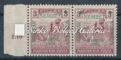 Leírás | 1919. Szeged (Francia megszállás) Ívszéli 45f/3f Arató bélyegpár mindkét bélyege felülnyomat hiányokkal! Bodor M. bélyegszakértő hátoldali bevizsgáló jelével. / 1919. Szeged (French occupation) 45f/3f Harvester stamp pair from the margin of the sheet, both stamps with deficient overprints! With the stamp expert, M. Bodor's proof sign on the backside. |