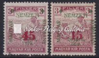 Leírás | 1919. Szeged (Francia megszállás) 45f/3f Arató bélyeg zárt és nyitott 4-es számjeggyel! Bodor M. bélyegszakértő hátoldali bevizsgáló jelével. / 1919. Szeged (French occupation) 45f/3f Harvester stamps with closed and open number 4! With the stamp expert, M. Bodor's proof sign on the backside. |
