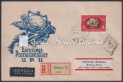 Leírás | 1950.07.21. Ajánlott légiposta levél BUDAPEST-NEW YORK között. Első napi boríték UPU bélyeggel és 20f bélyegkiegészítéssel bérmentesítve! / 1950.07.21. Registered airmail letter between BUDAPEST-NEW YORK. First day cover franked with UPU stamp and supplied with a 20f stamp! |