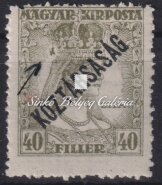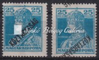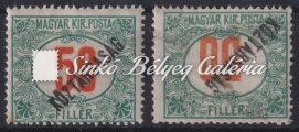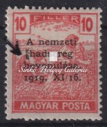 Description | 1919. A Nemzeti Hadsereg bevonulása (1919.XI.16.) - tévnyomat 10f SOC.MIS. feliratú bélyegen a felülnyomat HADSEREG felirata előtt festék folt van! / 1919. Entry of the National Army (1919.XI.16.) - misprint There is a paint spot before the subtitle HADSEREG (ARMY) of the overprint on 10f stamp with SOC.MIS. subtitle! |