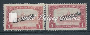 Description | 1918. Köztársaság - tévnyomat 1K bélyegen jelentős középrész eltolódás! / 1918. Republic - misprint Significantly shifted midsection on 1K stamp! |