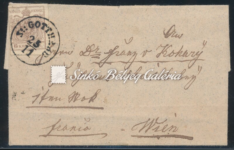 Leírás | 1852.11.25. Távolsági levél ST: GOTTHARD-WIEN között. Gépi 6kr bélyeggel bérmentesítve. A Gudlin katalógus csak 1858-tól hozza ezt a bélyegzőt! / 1852.11.25. Long distance letter between ST: GOTTHARD-WIEN. Franked with a machine-made 6kr stamp. The Gudlin catalogue mentions this stamping only from 1858! |