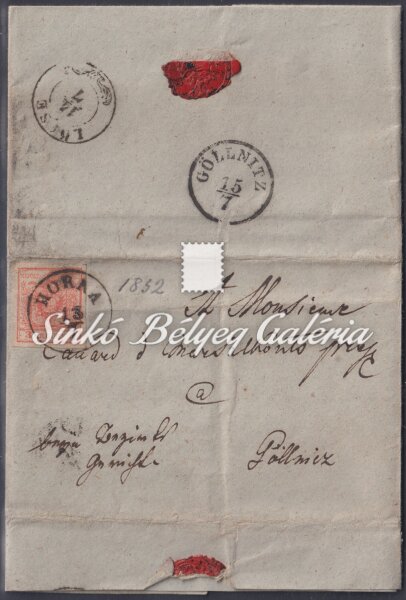Leírás | 1852.07.13. Távolsági levél HORKA-GÖLLNITZ között. 3kr bélyeggel bérmentesítve, teljes levéltartalommal. 500Gp / 1852.07.13. Long distance lette between HORKA-GÖLLNITZ. Franked with a 3kr stamp, and with full letter content. 500Gp |