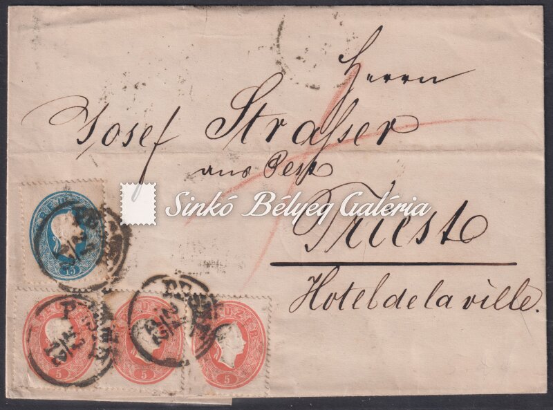 Leírás | 1861.12.27. Távolsági levél PESTH-TRIEST között. 15kr+3x5kr bélyegekkel bérmentesítve! / 1861.12.27. Long distance letter berween PESTH-TRIEST. Franked with 15kr+3x5kr stamps! |