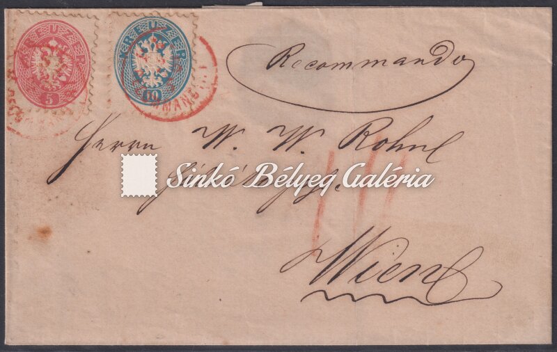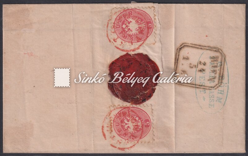 Leírás | 1865.05.25. Ajánlott távolsági levél PESTH-WIEN között. 3x5kr+10kr bélyegekkel bérmentesítve. / 1865.05.25. Registered long distance letter between PESTH-WIEN. Franked with 3x5kr+10kr stamps. |