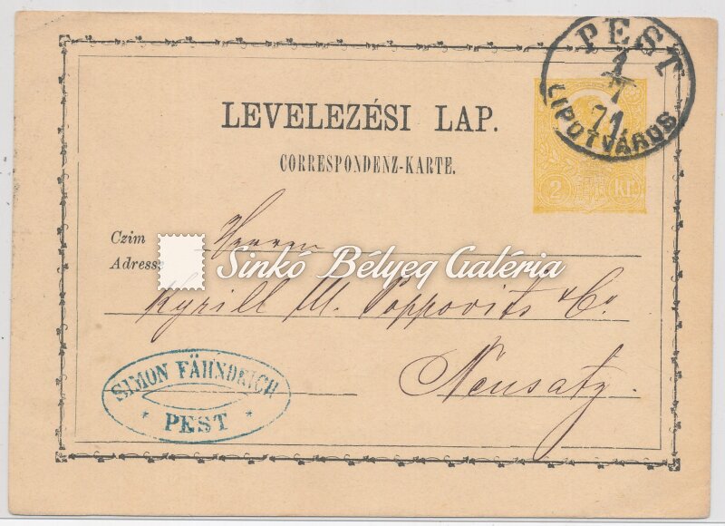 Leírás | 1871.07.01. Távolsági levél PEST-NEUSATZ között I. típusú, citromsárga 2kr Levelezőlapon. / 1871.07.01. Long distance letter between PEST-NEUSATZ on a type I., yellow coloured 2kr postcard. |