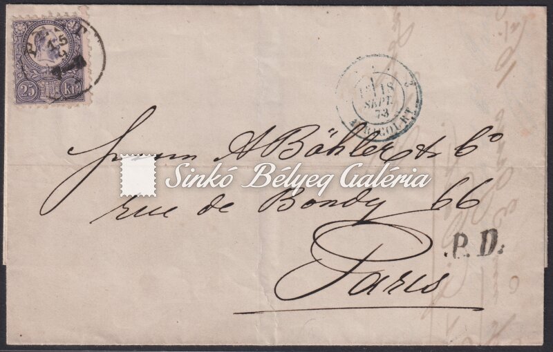 Description | 1873.09.15. Távolsági levél PEST-PARIS között. P.D. bélyegzővel. 25kr vörösibolya színű réznyomat bélyeggel bérmentesítve! R! Kiállítási darab! / 1873.09.15. Long distance letter between PEST-PARIS. With P.D. stamping. Franked with a 25kr reddish violet coloured engraved stamp! R! Exhibition piece! |