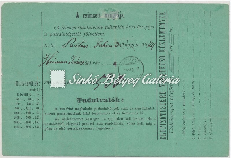 1874.02.01. 5kr Posta-utalvány HATVAN-PEST