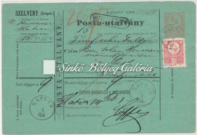 Description | 1874.02.01. 5kr Posta-utalvány HATVAN-PEST között. Utalvány összege 15Ft. 5kr réznyomat bélyegkiegészítéssel bérmentesítve, melynek alsó része ollóval levágott. / 1874.02.01. 5kr Postal-voucher between HATVAN-PEST. The amount of the voucher is 15Ft. Supplied and franked with a 5kr engraved stamp, which lower part is cut with scissors. |