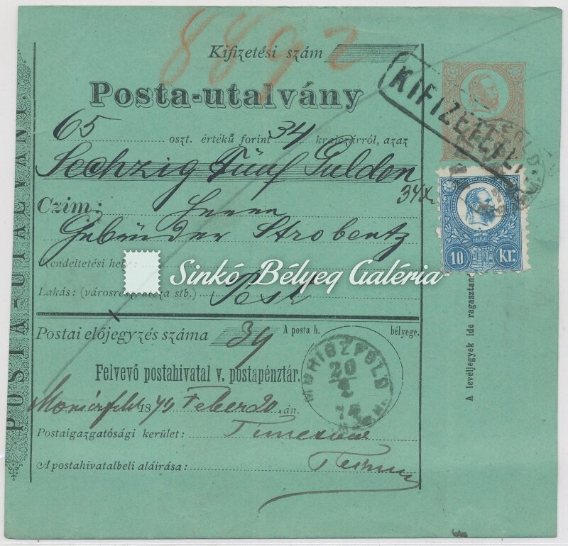 Description | 1874.02.07. Postai-utalvány 5kr MORICZFÖLD-PEST között. Réznyomású 10kr bélyegkiegészítéssel bérmentesítve. / 1874.02.07. Postal voucher 5kr Between MORICZFOLD-PEST. Supplied and franked with a 10kr engraved stamp. |