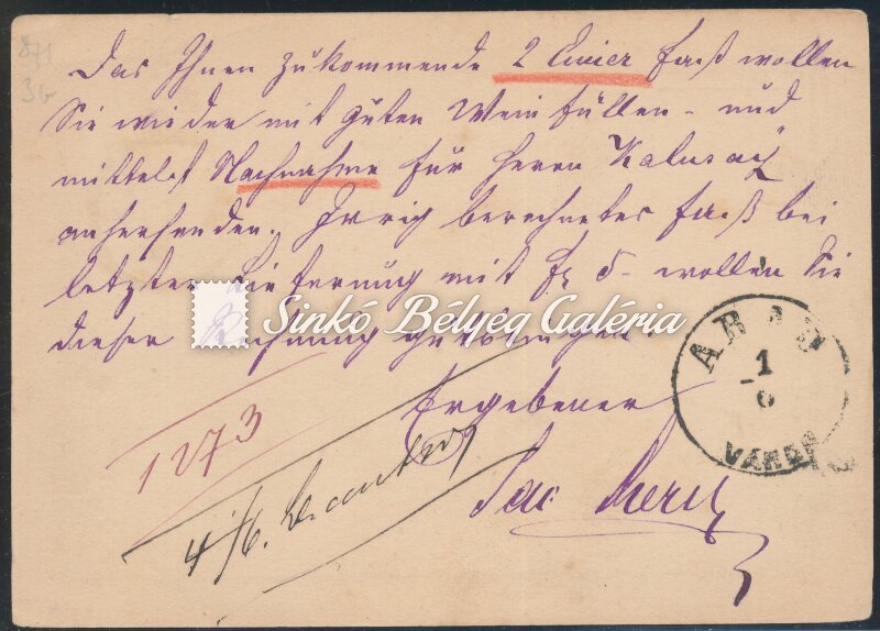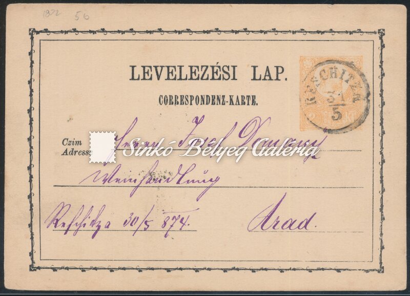 Description | 1874.05.31. Levelezési Lap RESCHITZA-ARAD között. 2k díjjegyes levelezőlapon. / 1874.05.31. Letter-card between RESCHITZA-ARAD. On a 2kr postal stationery postcard. |