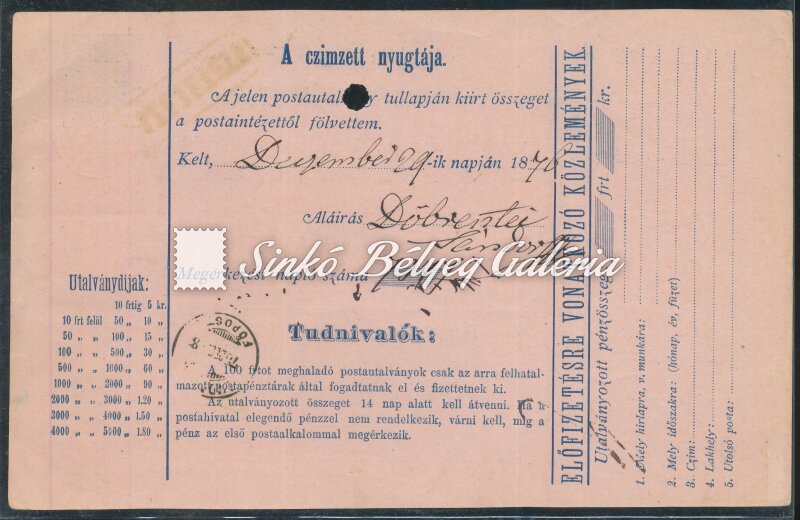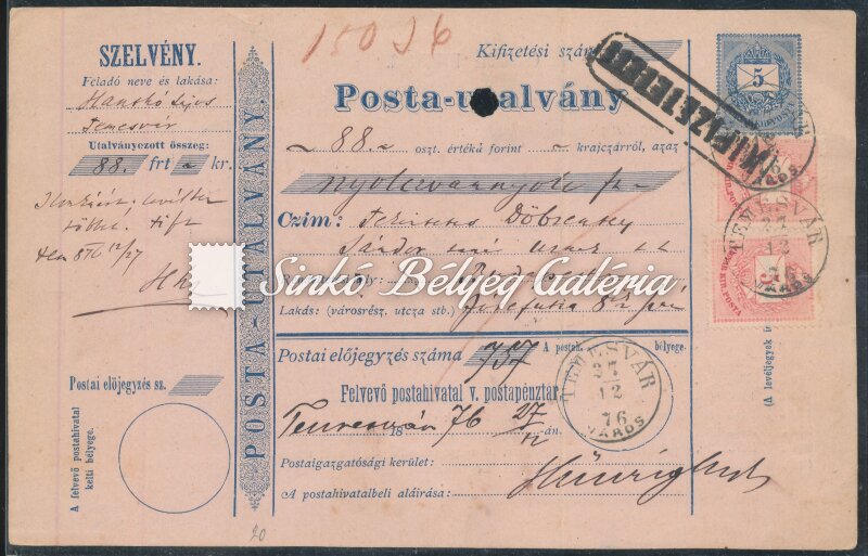 Leírás | 1876.12.27. 5kr Posta-utalvány TEMESVÁR/Város-BUDAPEST között. 2x5kr vízjel nélküli bélyegkiegészítéssel bérmentesítve! / 1876.12.27. 5kr Postal voucher between TEMESVAR/Varos-BUDAPEST. Supplied and franked with 2x5kr stamps without watermark! |