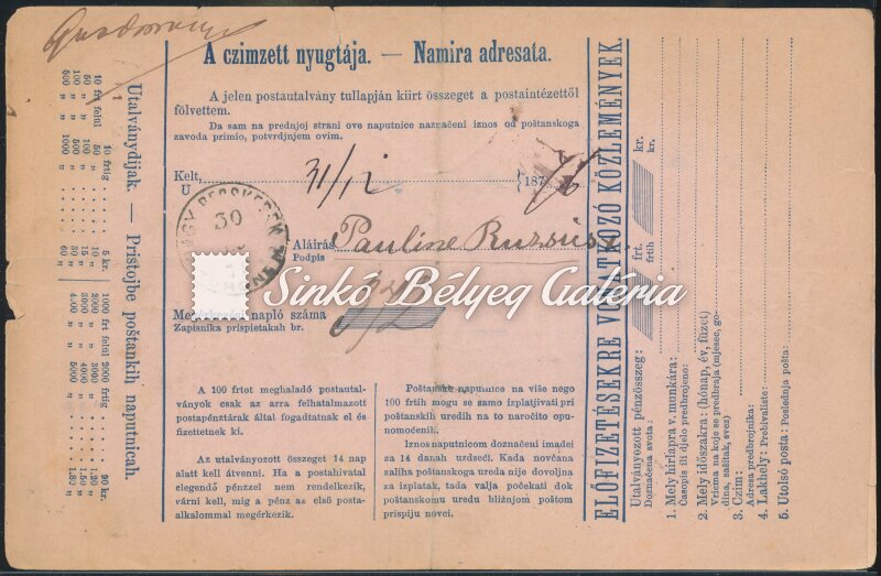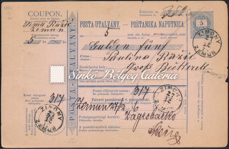 1876.12.27. 5kr kétnyelvű Magyar-Horvát Posta-utalvány ZIMONY-NAGYBECSKEREK