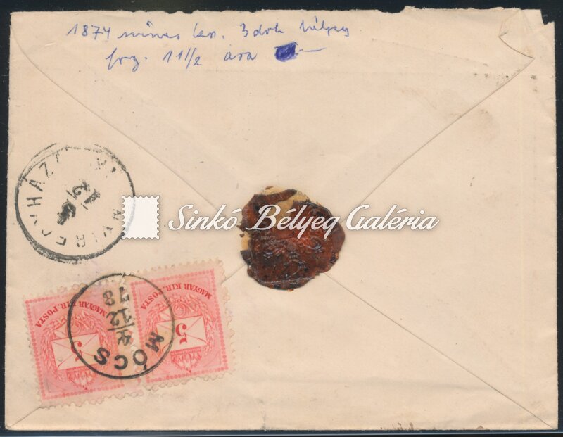 Leírás | 1878.12.04. Ajánlott távolsági levél MÓCS-KISVÁRDA között. 1874-es 11 1/2 fogazatú 3db 5kr bélyeggel bérmentesítve. / 1878.12.04. Registered long distance letter between MOCS-KISVARDA. Franked with 3pcs of 5kr stamps with 11 1/2 perforation from 1874. |