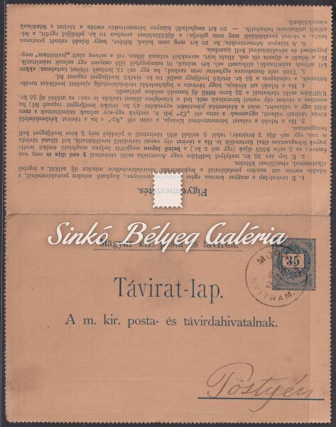 1889. 35kr díjjegyes Távirat-lap, PÖSTYÉN-WIEN