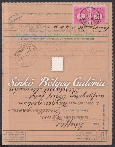 Leírás | 1889. 35kr díjjegyes Távirat-lap 5kr Színesszámú bélyegpárral díjkiegészítve, PÖSTYÉN-WIEN között. / 1889. 35kr postal stationery Telegram sheet supplied and franked with a 5kr Colour number krajcar stamp pair, between POSTYEN-WIEN. |