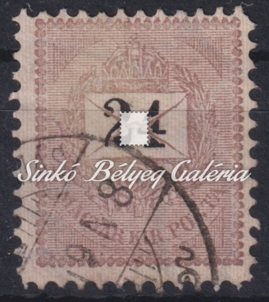 Leírás | 1889. Feketeszámú krajcáros 24kr bélyeg B 11 1/2 fogazattal. A nyomási sorrend felcserélődött, a hajtóka vonala az értékszám felé lett nyomva! / 1889. Black number krajcar 24kr stamp with B 11 1/2 perforation. The printing sequence has been reversed, the envelope flap line was printed above the denomination! |