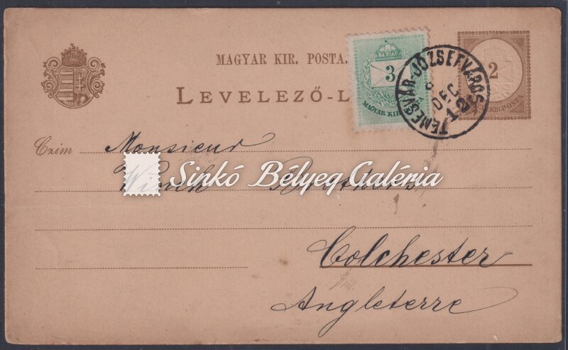 Leírás | 1895.12.12. Távolsági levél TEMESVÁR-JÓZSEFVÁROS - COLCHESTER között. 2kr Levelező-Lap 3kr bélyegkiegészítéssel bérmentesítve. / 1895.12.12. Long distance letter between TEMESVAR-JOZSEFVAROS - COLCHESTER. 2kr postcard supplied and franked with a 3kr stamp. |