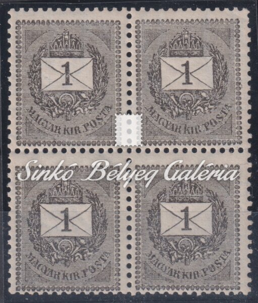 Leírás | 1898. Feketeszámú krajcáros 1kr bélyeg 4-es tömbben E 12:11 3/4 fogazattal, 4-es vízjelállással! Fogelválás! / 1898. Black number krajcar 1kr stamp in a block of 4 with E 12:11 3/4 perforation, and 4. watermark position! Faulty perforation! |