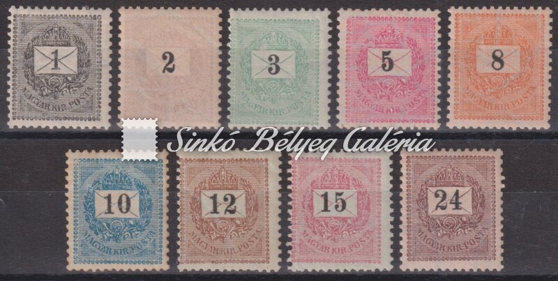 Description | 1898. Feketeszámú krajcáros 9db bélyeg eredeti gumival, szép állapotban! E 12:11 3/4 fogazattal! Katalógus érték: 42.000 HUF / 1898. Black number krajcar 9 stamps with original gum, in nice condition! With E 12:11 3/4 perforation! Catalogue value: 42.000 HUF |