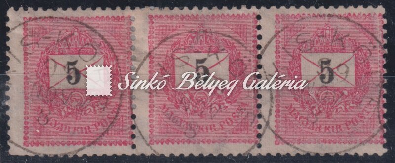 Leírás | 1899. Feketeszámú krajcáros 5kr bélyeg hármas csíkban, E 12:11 3/4 fogazattal, KIS-KÖRE lebélyezéssel! 40Gp / 1899. Black number krajcar 5kr stamp in a stripe of 3 with E 12:11 3/4 perforation and KIS-KORE cancellation! 40Gp |