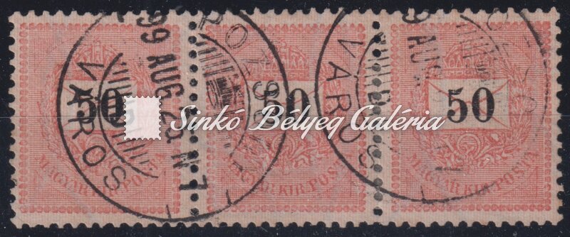 Leírás | 1899. Feketeszámú krajcáros 50kr bélyeg hármas csíkban, 2. vízjelállással, POZSONY/VÁROS lebélyezéssel! 1100 pont / 1899. Black number krajcar 50kr stamp in a stripe of 3 with 2. watermark position and POZSONY/VAROS cancellation! 1100 pont |