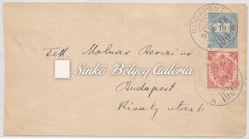 Leírás | 1899.07.15. Helyi levél BUDAPESTen. 10kr díjjegyes boríték Osztrák-Magyar Monarchia - Bosnia 5kr könyvnyomású bélyegkiegészítéssel bérmentesítve. Hátoldali érkező bélyegzővel. / 1899.07.15. Local letter in BUDAPEST. 10kr postal stationery envelope supplied and franked with a 5kr typography stamp of the Austro-Hungarian Monarchy - Bosnia. With arriving cancellation on the backside. |