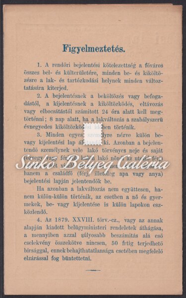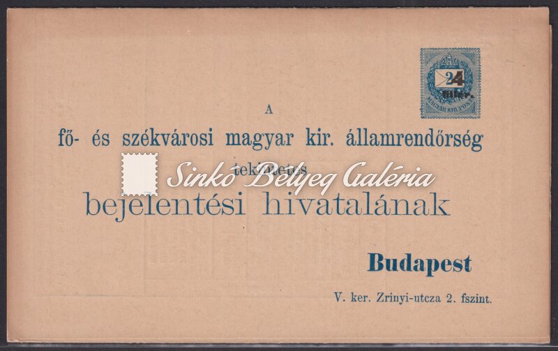 Leírás | 1900. Felülnyomással értékelt rendőrségi levelezőlap 4f+4f kék, sárga papír. / 1900. Police postcard with overprint, 4f+4f blue and yellow paper. |