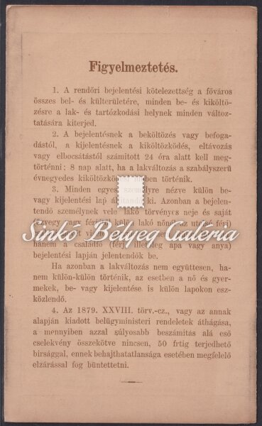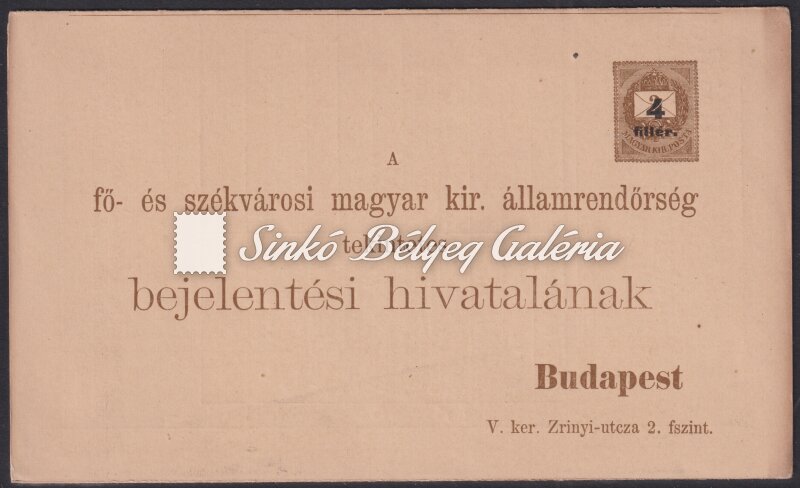 Leírás | 1900. Felülnyomással értékelt rendőrségi levelezőlap 4f+4f barna, sárga papír. / 1900. Police postcard with overprint, 4f+4f brown and yellow paper. |