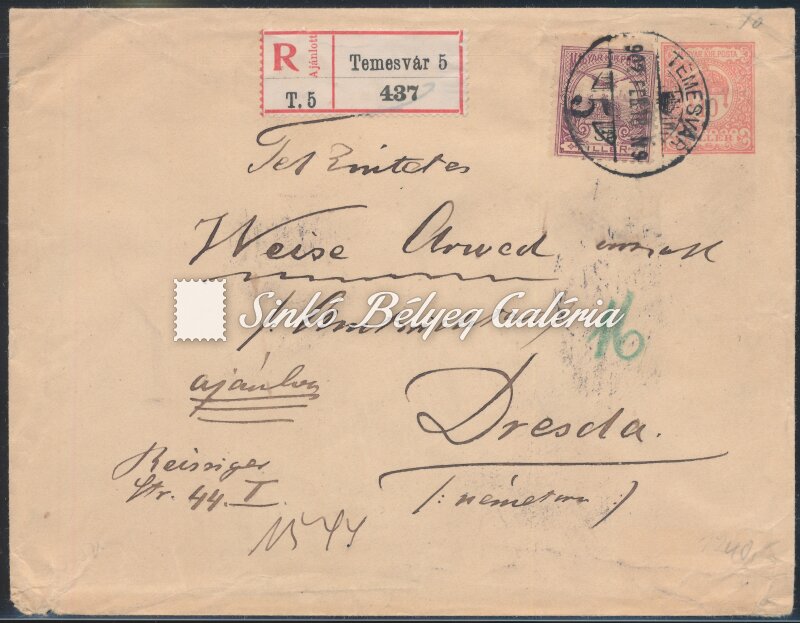 1902.02.18. Ajánlott levél TEMESVÁR-DRESDA