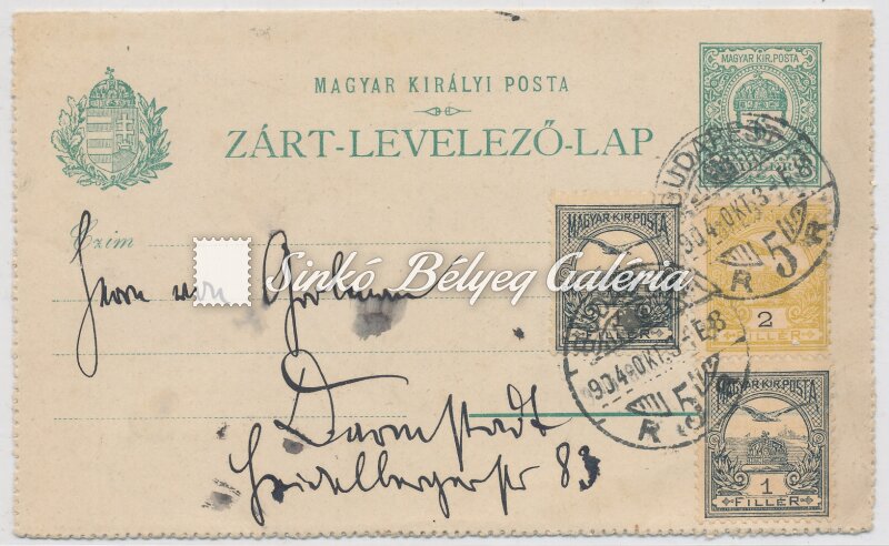 Leírás | 1904.10.03. Távolsági levél BUDAPESTről indítva. 6f zárt levelező-lap 2x1+2kr bélyegkiegészítéssel bérmentesítve. / 1904.10.03. Long distance letter sent from BUDAPEST. 6f closed postcard franked and supplied with 2x1+2kr stamps. |