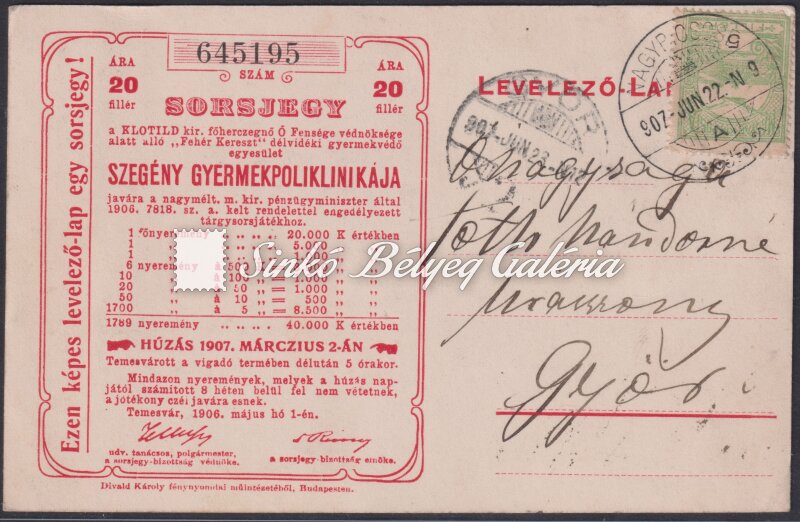 Description | 1907. Sorsjegyes Levelező-lap GYŐRbe küldve. 5f Turul bélyeggel bérmentesítve! / 1907. Lottery ticket postcard sent to GYOR. Franked with a 5f Turul stamp! |
