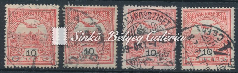 Leírás | 1908. Turul 10f bélyegek mind a 4 féle vízjelállással! Katalógus érték: 13.400 HUF / 1908. Turul 10f stamps with all the 4 position watermarks! Catalogue value: 13.400 HUF |