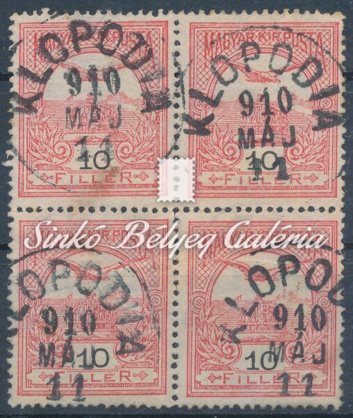 Leírás | 1909. Turul 10f bélyeg 4-es tömbben KLOPODIA (RO) lebélyegzéssel! 50Gp / 1909. Turul 10f stamp in a block of 4 with KLOPODIA (RO) cancellation! 50Gp |