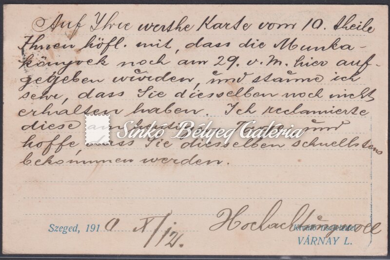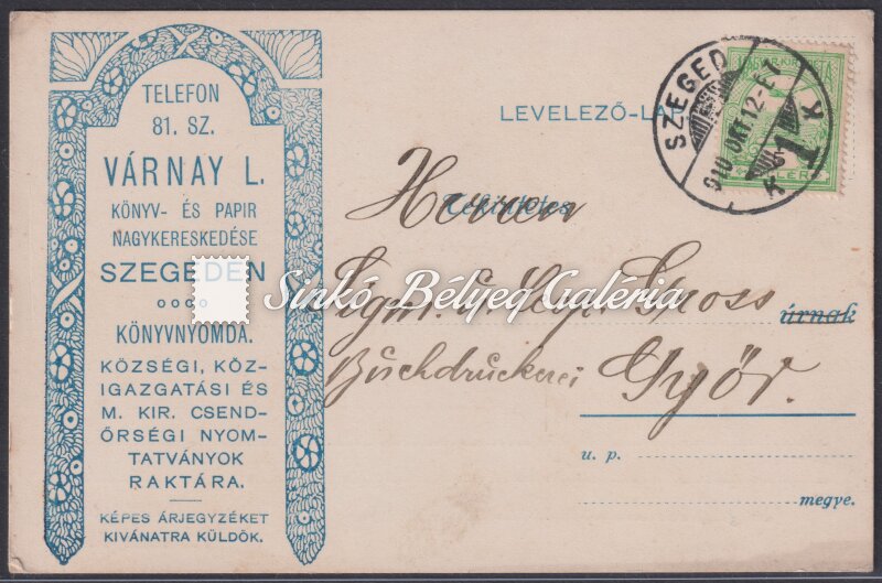 Leírás | 1910.10.12. Levelező-lap SZEGED-GYŐR között. Várnay L. Könyvkereskedés- és nyomda hírdetéssével! / 1910.10.12. Postcard between SZEGED-GYOR. With the advertisement of L. Varnay's Bookshop and Printing House! |