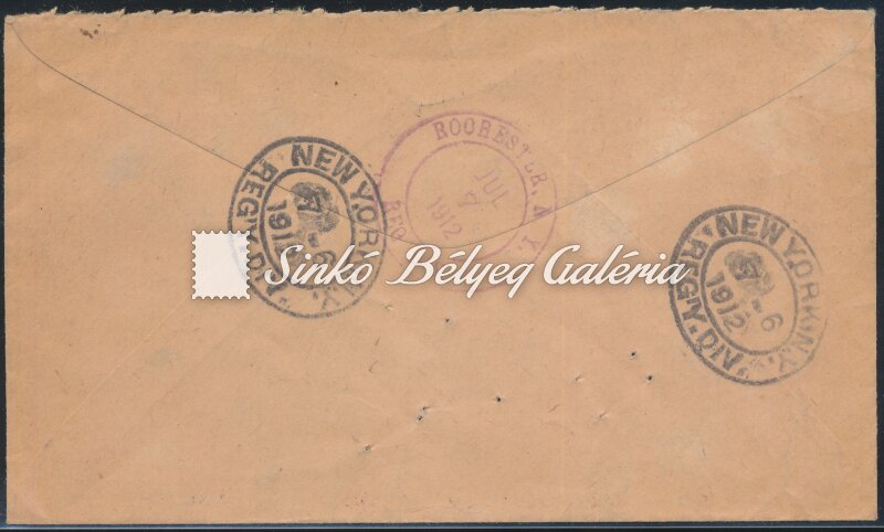 Leírás | 1912.06.24. Ajánlott távolsági levél TEMESVÁR-ROCHESTER, N.Y. (USA) között. 50f Turul bélyeggel bérmentesítve! / 1912.06.28. Registered long distance letter between TEMESVAR-ROCHESTER, N.Y. (USA). Franked with a 50f Turul stamp! |