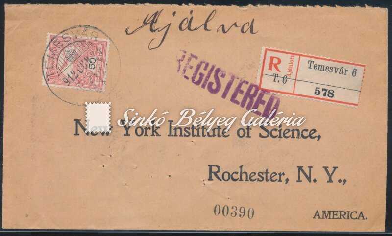 1912.06.24. Ajánlott távolsági levél TEMESVÁR-ROCHESTER