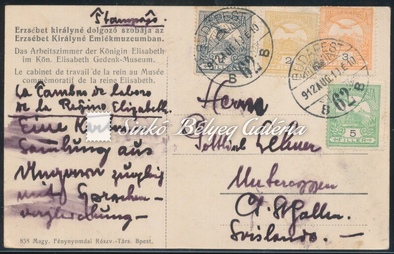 Leírás | 1912.08.19. Képeslap BUDAPEST-ST. GALLEN (SUI) között. 4 Turul bélyeggel színesen bérmentesítve, összesen 10f viteldíj. / 1912.08.19. Postcard between BUDAPEST-ST. GALLEN (SUI). Colourful franking with 4 Turul stamps, altogether 10f fare! |