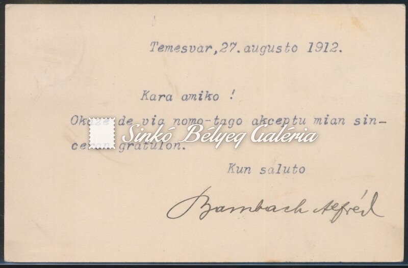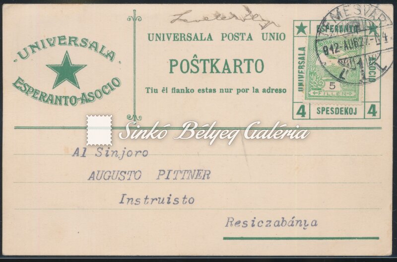 1912.08.27. Eszperantó levelezőlap TEMESVÁR-RESICZABÁNYA