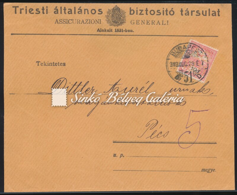 Description | 1913.12.29. Perfin levél BUDAPEST-PÉCS között. A Triesti általános biztosító társulat céglyukasztásával ellátott 10f Turul bélyeggel bérmentesítve! / 1913.12.29. Perfin letter between BUDAPEST-PECS. Franked with a 10f Turul stamp with Triesti general insurance company's perfin punching! |