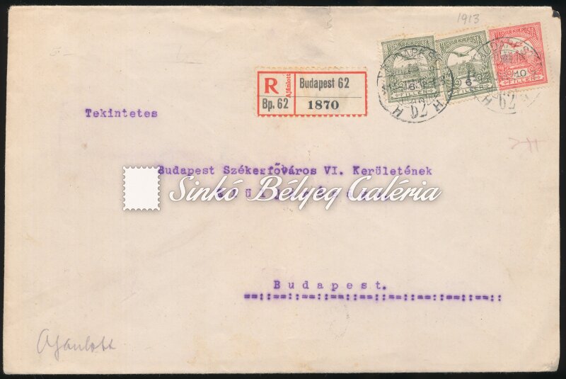Description | 1914.01.15. Helyi ajánlott levél BUDAPESTen 2x6f és 10f Turul bélyegekkel bérmentesítve. / 1914.01.15. Local registered letter in BUDAPEST franked with 2x6f and 10f Turul stamps. |